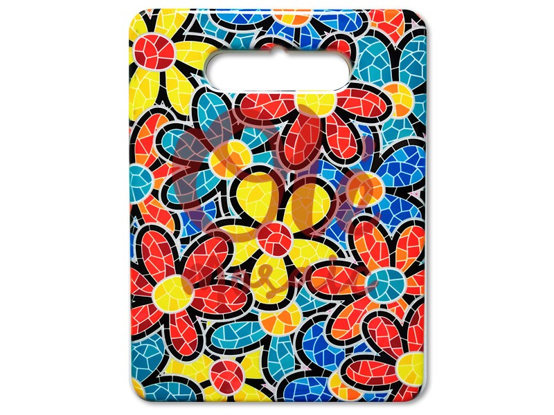 This ceramic cutter, decorated with vibrant floral motifs, is an exceptional representation of the famous Spanish mosaic style. Made of high-quality ceramic, this utensil is not only practical but also adds an artistic and colorful touch to any kitchen. The design stands out for its bright color palette, including red, blue, yellow, and green flowers, enhanced by a black background that highlights its beauty and elegance.