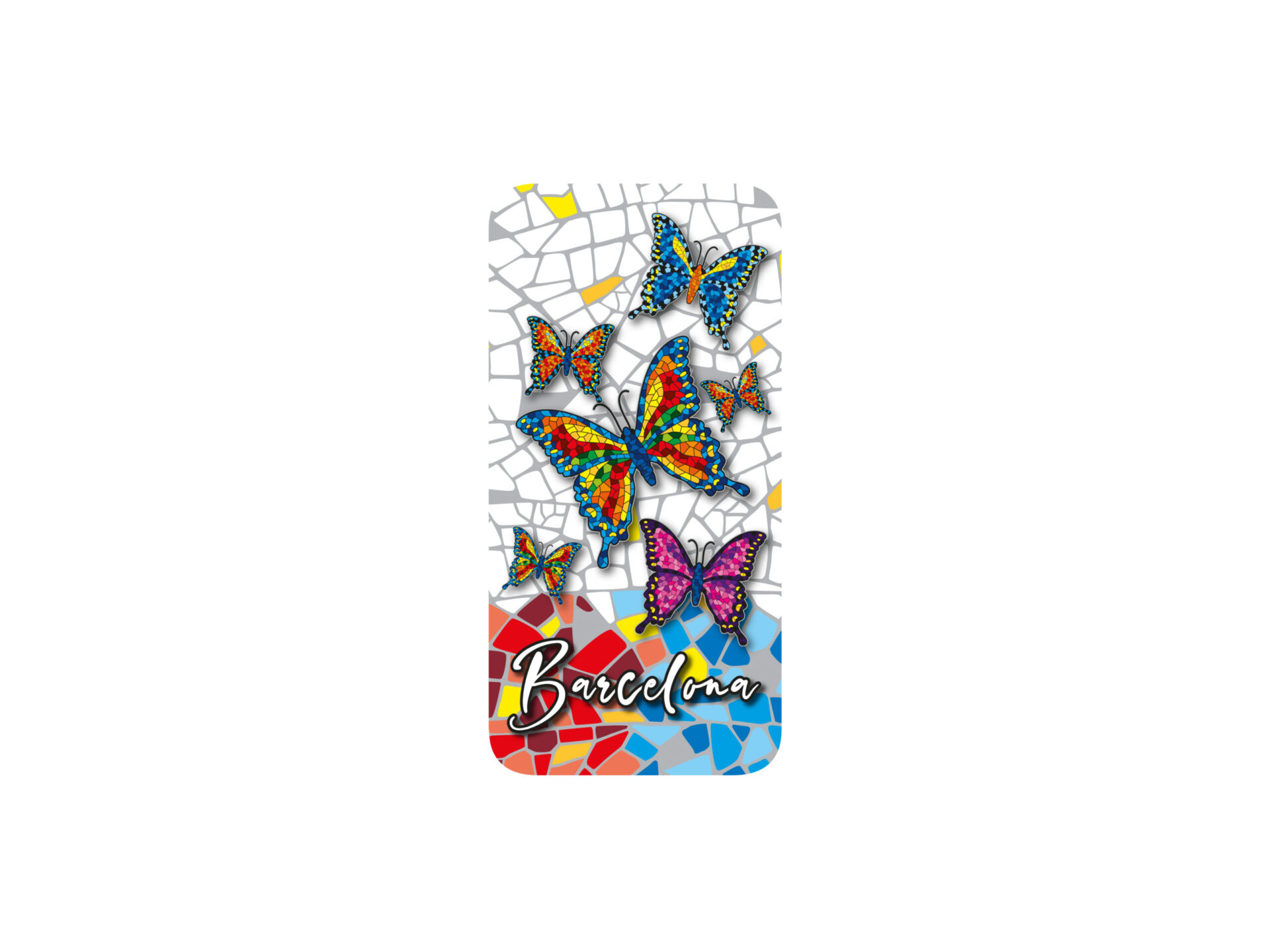 iPhone 13 Pro case made of TPU, decorated with vibrant butterflies that evoke Barcelona’s colorful mosaic. This design features a series of hand-painted effect butterflies in bright shades of blue, red, and yellow on a white background with ceramic details. The word “Barcelona” is displayed in an elegant typography, turning this case into a distinctive souvenir that combines protection and typical Barcelonian art.
