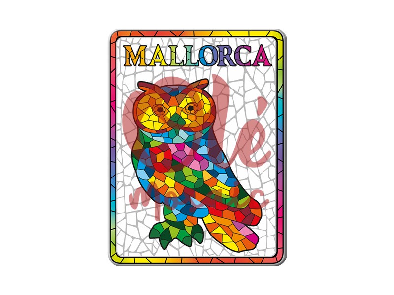 8 cm metal magnet decorated with a colorful owl, representing the culture of Mallorca. Its vibrant design includes a variety of tones that form a brilliant mosaic, symbolizing the island’s rich artistic tradition. At the top, the name “MALLORCA” stands out in striking letters, framed by a textured background that enhances the piece. Ideal for remembering the beauty and folklore of Mallorca in any space.