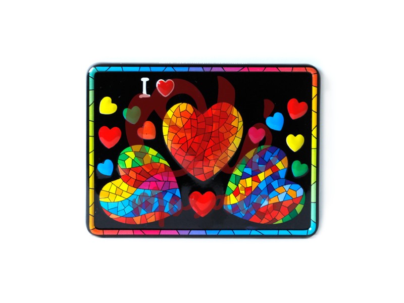 Heart-shaped metal magnet with a vibrant design on a black background. It features hearts of different sizes and colors, with mosaic elements in red, blue, and yellow tones, giving it a striking appearance. It measures 8 cm, and the inscription “I ❤️” enhances its appeal, making it an ideal souvenir to celebrate special moments in Spain or Portugal.