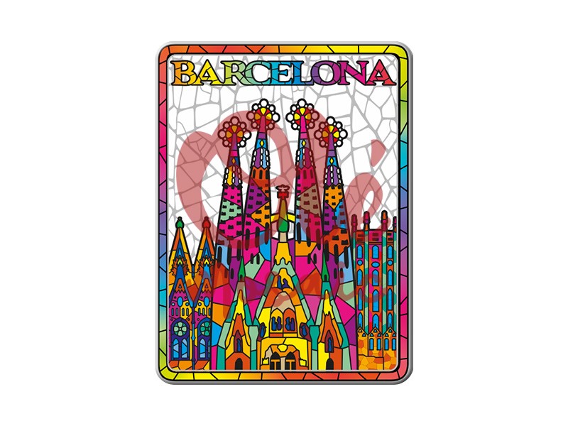 This 8 cm metal magnet is an attractive souvenir representing Barcelona’s iconic Sagrada Familia, one of architect Antoni Gaudí’s masterpieces. Its vibrant illustration, created in a colorful mosaic style, captures the essence of this monument with bright tones that evoke the uniqueness of its architecture. Details in fuchsia, blue, and yellow bring the basilica’s iconic towers and facades to life, creating a spectacular design that highlights its majesty.