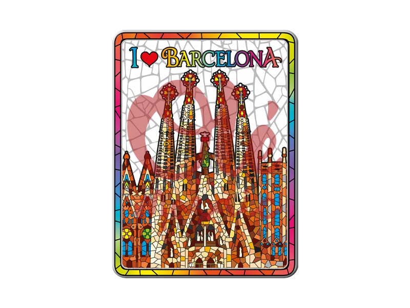 8 cm metal magnet showing a vibrant representation of the Sagrada Familia, the emblematic Barcelona monument. This magnet stands out for its design in vivid colors, with gold and silver tones that evoke the majesty of Gaudí’s work. Decorated in a mosaic style, it includes the text “I ♥ BARCELONA” at the top, making it an ideal souvenir for art and architecture lovers.