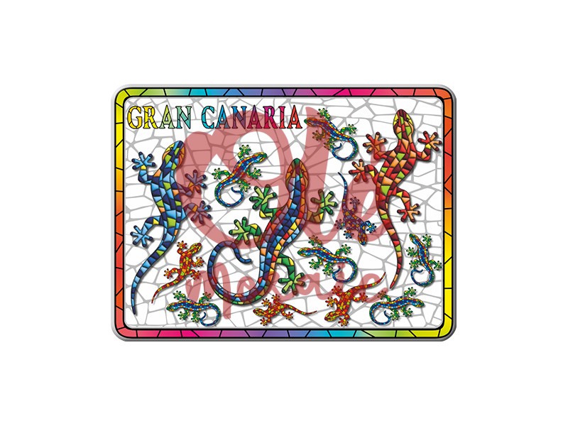 Metal magnet decorated with colorful salamanders, representing the unique fauna of Gran Canaria. Measuring 8 cm, this souvenir features a vibrant and cheerful design, with a background in white tones and mosaic elements that evoke the Canarian artistic tradition. The text “Gran Canaria” stands out at the top, making it a perfect memento of this enchanting island. Ideal for those who wish to take a piece of its culture with them.