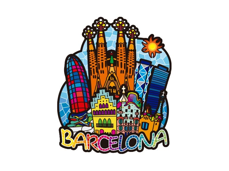 A magnet offering a vibrant panoramic view of Barcelona. This attractive magnet features iconic landmarks such as the Sagrada Familia and Casa Batlló, with a colorful and detailed design. The buildings stand out with a glossy finish, combining blue, yellow, and red tones that evoke the city’s modernist art. Below the illustration, the word “Barcelona” is highlighted with striking colors, making this magnet a perfect souvenir of the Catalan capital.