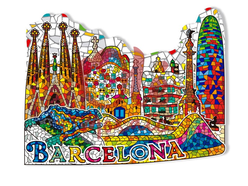 Magnet with a vibrant panoramic view of Barcelona, capturing the essence of the modernist city. This colorful magnet features emblematic icons such as the Sagrada Familia, Casa Batlló, and Park Güell, all represented in a mosaic-style design reminiscent of Gaudí’s works. With multi-colored details and a base highlighting the name “Barcelona”, this souvenir is perfect for remembering the city’s architectural and cultural beauty.