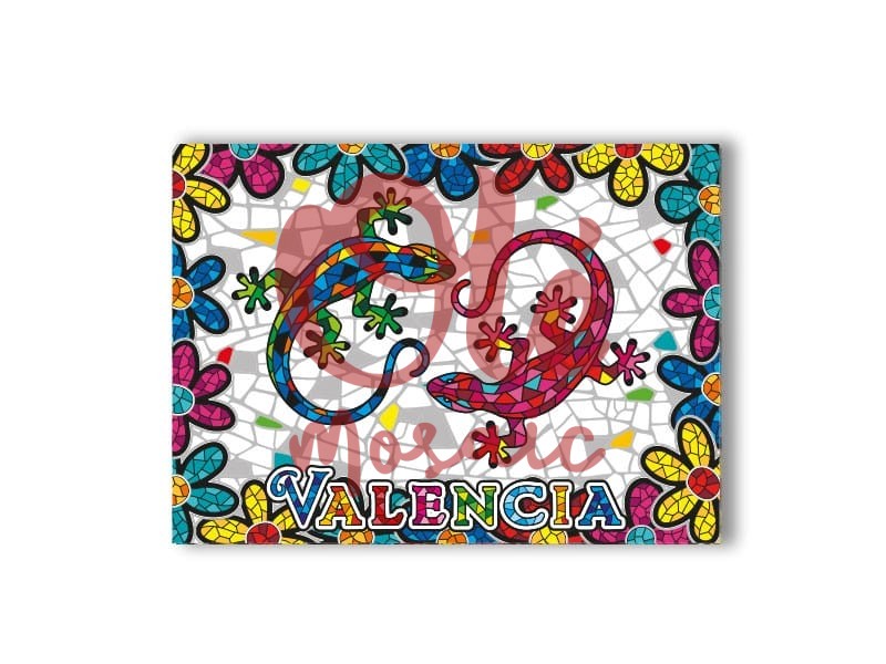 This 7.5 cm resin magnet is a vibrant representation of Valencian modernism and culture. Decorated with two beautiful salamanders in blue and red tones, it captures attention with an energetic design, framed by brightly colored floral motifs that evoke the rich Mediterranean flora. The base of the magnet features a visual effect that imitates mosaic, a nod to the city’s emblematic artwork, creating a captivating contrast that highlights the vivid colors of the decorative elements. The word “Valencia” appears in large, multicolored letters, making this souvenir a memorable and representative memento of the city.