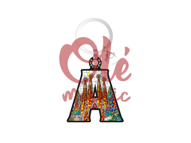 Wooden keychain in the shape of the letter “A”, inspired by Barcelona’s iconic Sagrada Familia. This striking keychain features a colorful and detailed design, with illustrations that highlight the architectural elements of Gaudí’s work, such as the towers and vibrant mosaics. With a glossy finish, this souvenir is perfect for evoking the magic of Barcelona, while keeping your keys organized and handy.
