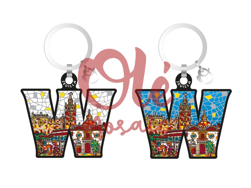 Wooden keychain featuring the letter “W” representing Seville. This keychain presents a colorful illustration combining iconic elements of the city, such as the Giralda and horse-drawn carriages, in a vibrant, handcrafted, hand-painted design. With mosaic details and a color palette that includes blues, yellows, and reds, it is a unique souvenir that captures the cultural essence of Seville. An ideal accessory to always carry a piece of the city with you.
