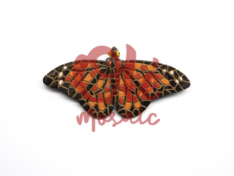 Butterfly figurine, handcrafted design, hand-painted, 12 cm tall, with a vibrant design in red and orange tones. This ornament stands out for its detailed artistic work, featuring a mosaic-simulating wing pattern and a delicate silhouette, ideal for decorating any space with a touch of color. The butterfly, with its yellow eyes and black accents, evokes the beauty of nature and brings a fresh and distinctive flair to any environment.