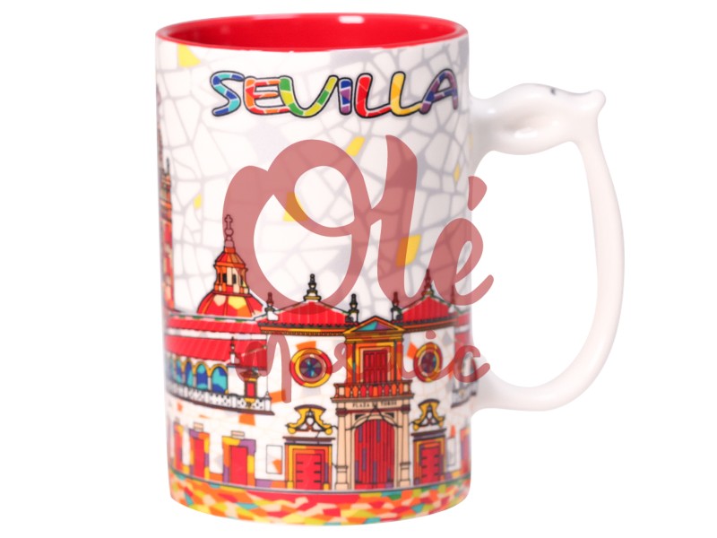 XL ceramic mug decorated with a vibrant representation of Sevillian architecture. This exclusive 13 cm mug, with an elegant white finish, features the word “Sevilla” in multicolored letters that capture the festive essence of this charming Andalusian city. Its design highlights the representation of emblematic monuments, each meticulously illustrated to bring architectural details to life, reflecting the rich history and culture of Seville. The base of the mug features a mosaic of colors that evokes Andalusian artistic traditions, while the interior, in a vibrant red tone, adds a contemporary touch.