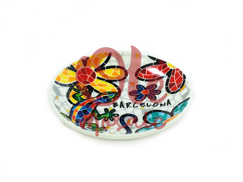 This 10 cm ceramic plate, with a vibrant salamander and flower design, is a distinctive souvenir from Barcelona, ideal for those seeking an authentic keepsake. This attractive plate features a white background on which a colorful salamander unfolds in blue and green tones. Surrounding this emblematic element, we find a cluster of flowers in striking reds, yellows, and blues, evoking the rich flora of the region. The intricate trencadís design, characteristic of the famous architect Antoni Gaudí, highlights the product’s connection to the modernist art that can be appreciated in many of the city’s monuments.