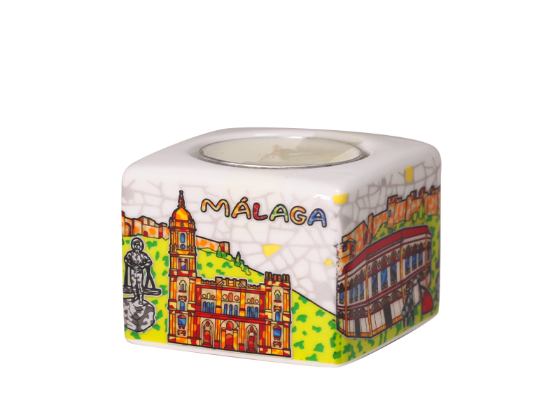 Square-designed ceramic candle holder, decorated with striking illustrations of emblematic Malaga monuments. This attractive white candle holder stands out for its artisanal, hand-painted design and its vibrant graphic details, including the famous Plaza de la Merced and the Cathedral. The word “Malaga” is printed in eye-catching colors, adding a cheerful touch to the atmosphere. Ideal for decorating any space with a touch of Andalusian tradition.