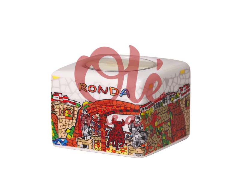 Ceramic candle holder inspired by the beautiful city of Ronda. This elegant white candle holder features a vibrant design with panoramic views of Ronda’s famous bridge and a bull figure, decorated with a colorful mosaic and textured details. The text “RONDA” is printed in a striking style, complementing the handcrafted, hand-painted design that highlights the cultural richness of this emblematic Andalusian destination. Perfect for adding a touch of light and tradition to any space.