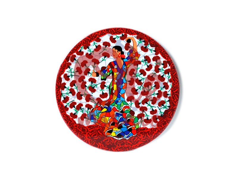 This ceramic coaster, decorated with the vibrant image of a flamenco dancer, is an authentic tribute to Andalusian folklore. With a colorful and festive design, the elegant coaster features a white background adorned with delicate red flowers that enhance its visual appeal. In the center, the dancer is shown in a dynamic pose, dressed in a splendid ruffled costume in a mix of blue and red tones, gracefully capturing the movement and passion of flamenco art.