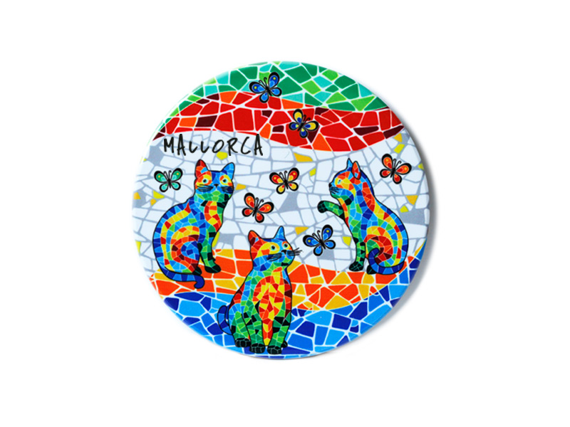 This ceramic coaster, decorated with cheerful cats, is a magnificent representation of Mallorca’s vibrant atmosphere. Designed with mosaic technique, this object is not only functional but also an artistic piece that enhances any space. Its hand-painted design shows three adorable cats in different poses, each with striking colors that capture the joyful and carefree essence of life on this beautiful island. Surrounded by butterflies that add dynamism, the multicolored background perfectly complements the cat figures, creating a unique visual appeal that will attract those looking for genuine and representative souvenirs.
