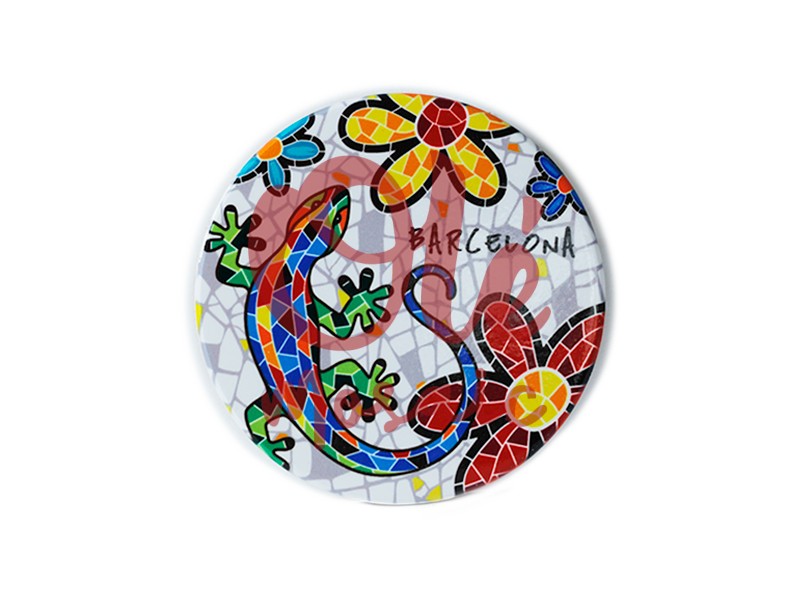 This ceramic coaster, decorated with a salamander and colorful flowers, is a magnificent representation of Barcelona’s vibrant aesthetic. With a design inspired by Antoni Gaudí’s famous mosaic, this elegant accessory stands out for its illustration in red, blue, and green tones that exquisitely contrast against a white background. Circular in shape, the coaster features a mosaic-style salamander, capturing the energy and dynamism of the Catalan capital, surrounded by colorful flowers that bring a fresh and cheerful air.