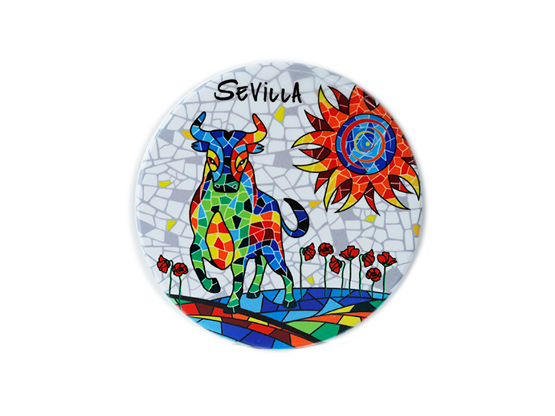 Ceramic coaster decorated with a vibrant mosaic depicting a bull, an emblematic symbol of Spanish culture, especially in Seville. This artisanal, hand-painted coaster stands out for its bright colors and artistic motifs, such as a radiant sun and red flowers, all on a mosaic-style background. With the name “Sevilla” printed on the top, it is ideal for those who wish to bring a piece of Andalusian tradition into their home.