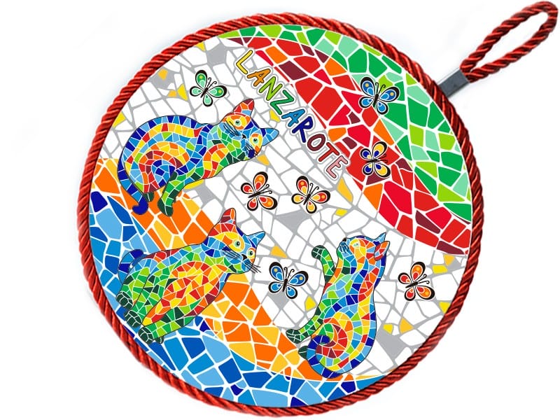 Ceramic trivet inspired by the vibrant atmosphere of Lanzarote. This colorful trivet features a mosaic cat design, adorned with butterflies and details in vivid tones such as red, blue, green, and yellow. The artisan, hand-painted design technique highlights local creativity and art, while the ‘Lanzarote’ inscription adds a distinctive touch. Ideal for adding an artistic and warm touch to your table.