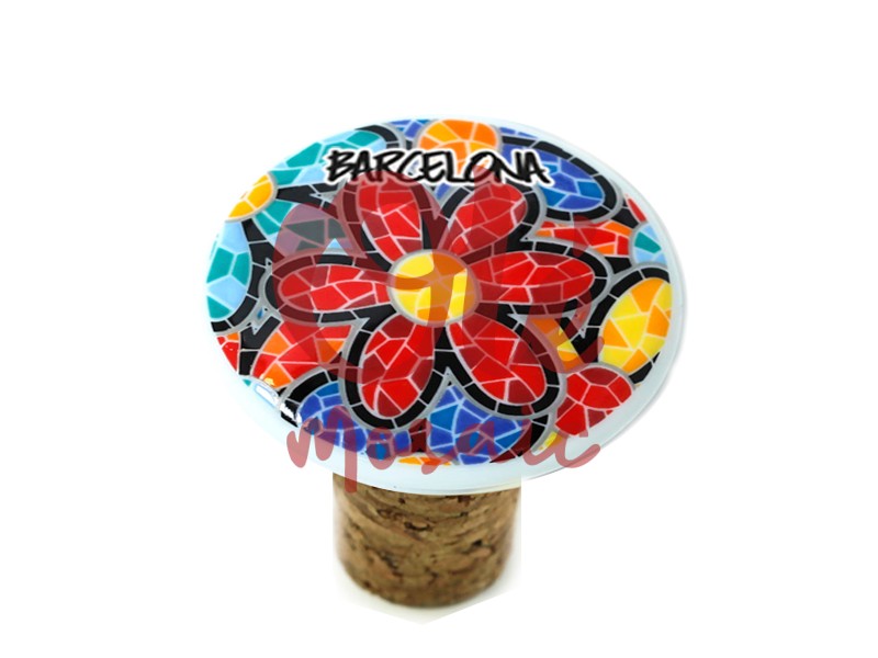 Ceramic stopper decorated with a vibrant floral design, inspired by Barcelona’s famous mosaic work. This attractive stopper features a cork base, with a white top displaying a red flower in the center, surrounded by colorful tiles in blue, yellow, and orange tones. Perfect for sealing bottles, this souvenir captures the artistic and colorful essence of the city, adding a distinctive touch to any home.
