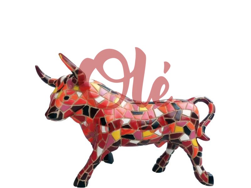 The 11 cm resin bull figure is an authentic tribute to rich Spanish tradition, ideal for those seeking a representative souvenir. This piece, with a hand-painted effect, stands out for its vibrant colorful mosaic decoration, which evokes the emblematic colors of bullfighting culture, with a predominance of reds, yellows, and blacks. Each figure is unique, meticulously crafted to capture the essence of the country’s iconic symbol. The bull, an integral part of Spanish history and festivities, not only represents the strength and passion of the Spanish people but is also an exquisite memento for those who wish to take a piece of Spain with them. The defined shapes and careful details of its design enhance its decorative character and allow appreciation of the artisanal skill behind each creation. This bull souvenir is perfect as a decorative item or for lovers of Spanish tradition. At Olé Mosaic, as a wholesaler of souvenir items, we offer this bull figure that promises to be a magnet for tourists and an excellent addition to any tourist gift shop.