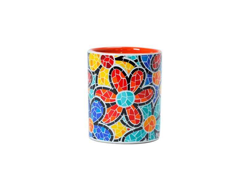 Ceramic shot glass decorated with vibrant flowers in a colorful mosaic design. This attractive glass, with a white base and red interior, features a charming combination of blue, yellow, and red tones that evoke the vibrant style of Spanish folk art. Perfect for serving drinks at celebrations or as a decorative piece, this glass stands out for its handcrafted, hand-painted design technique, ideal for those seeking a cheerful touch in their home.