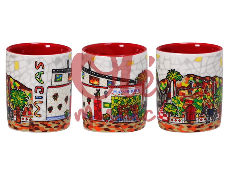Ceramic shot glass, inspired by the picturesque streets of Mijas. This colorful glass features a detailed design with elements of the Bullring and the typical architecture of the village, highlighting the palm trees and whitewashed houses. Its red interior contrasts with the white ceramic exterior decorated with a vibrant mosaic, making each sip a clear representation of Andalusian folklore. Ideal as a souvenir or gift.