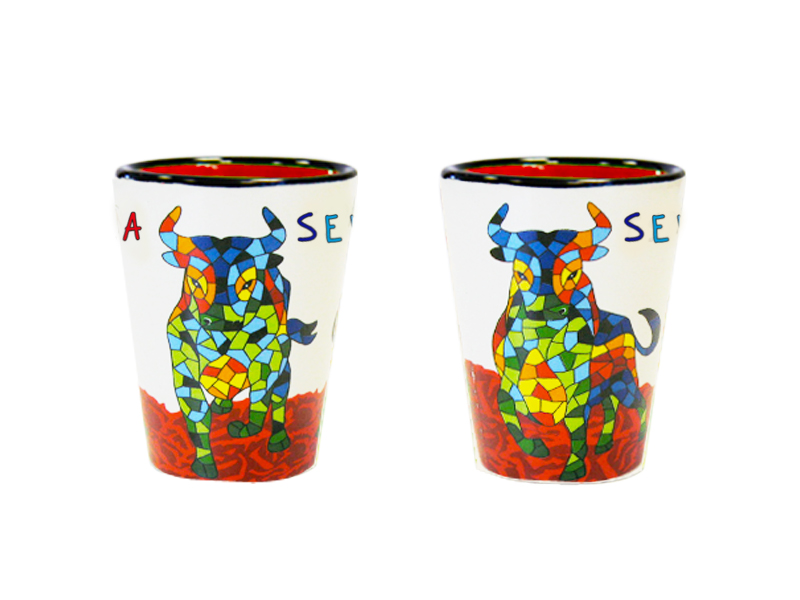 Ceramic shot glass with a unique design, inspired by the emblematic bull of Seville. This glass features a colorful mosaic in vibrant tones on a beige background, with the word “Seville” stamped on the front. Its decorative details and the artisanal, hand-painted design technique give it an artistic touch, making it an excellent souvenir of Sevillian culture. Ideal for enjoying your shots and as an ornament in any corner.