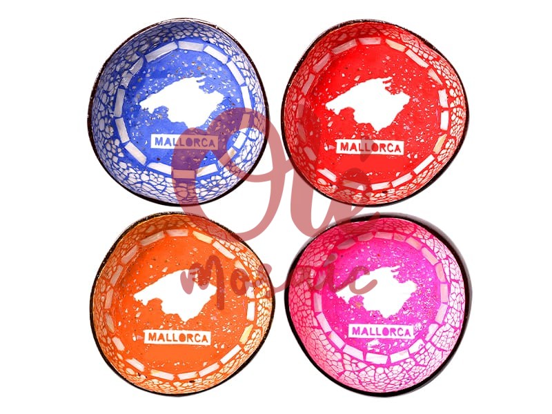 Olé Mosaic » Bols » 4 Bols en noix de coco de 13 x 6 cm. Bleu, rouge, orange et rose. Île. Majorque.