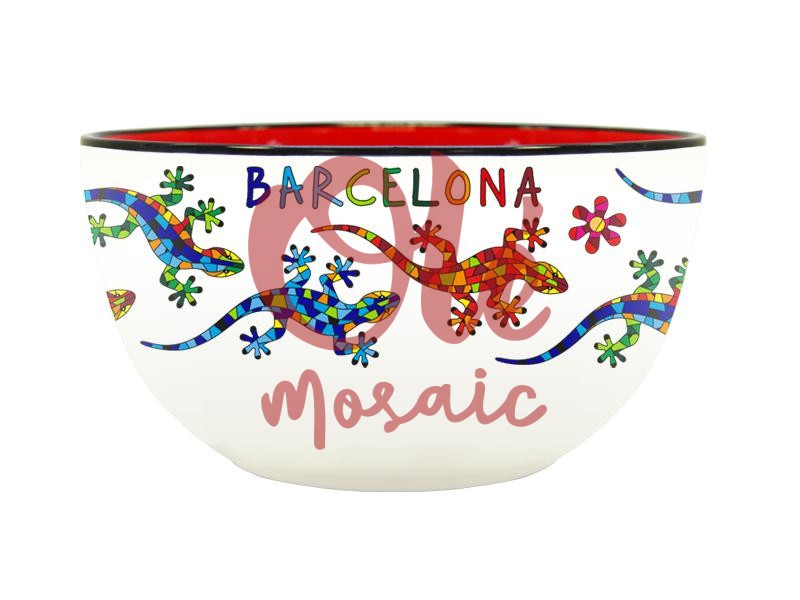 Este cuenco de cerámica de 17 cm está decorado con salamandras de colores, un símbolo entrañable de Barcelona. Su diseño pintado a mano destaca sobre un fondo beige que realza las ilustraciones vivas en azul, rojo y verde, evocando el famoso estilo mosaico de la obra de Antoni Gaudí. En este cuenco, las salamandras, rodeadas de delicadas flores decorativas, parecen cobrar vida, reflejando la vibrante cultura catalana. El interior del cuenco es de un intenso color rojo, creando un atractivo contraste que añade profundidad y carácter a la pieza.