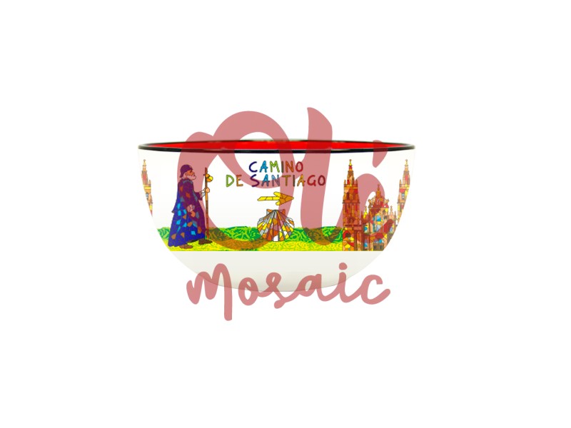 Bol de cerámica de 9 cm, decorado con ilustraciones coloridas inspiradas en el Camino de Santiago. Este elegante bol presenta una vibrante paleta de colores, con azules, verdes y amarillos, y un borde rojo que realza su diseño. Las escenas representadas incluyen un peregrino con su bordón y la emblemática concha del camino, junto a imponentes monumentos que evocan la historia de la peregrinación. Ideal como recuerdo o para darle un toque español a tu hogar.