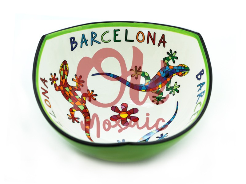 El borde del cuenco está adornado con la palabra « Barcelona », lo que enfatiza su procedencia y conecta emocionalmente a los turistas con la ciudad. Este cuenco no solo es perfecto para servir aperitivos, sino que también puede funcionar como una pieza decorativa encantadora que dará un aire mediterráneo a cualquier hogar. Su conexión cultural es profunda, ya que las salamandras son representativas del diseño modernista catalán, reflejando el espíritu creativo que caracteriza a Barcelona.