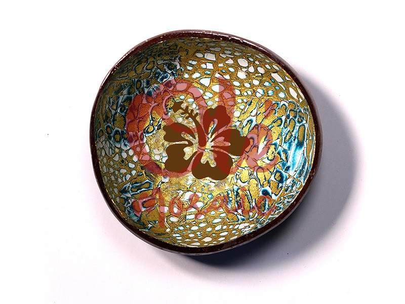 Bol de coco azul inspirado en la naturaleza, con un diseño único que presenta motivos de hibisco en el centro. Fabricado con coco, su interior resplandece con tonos dorados y azules, gracias a una técnica de pintado que crea una textura visual atractiva. Este bol es perfecto para servir aperitivos o como elemento decorativo, evocando el encanto tropical de las islas e ideal para añadir un toque de frescura a cualquier ambiente.