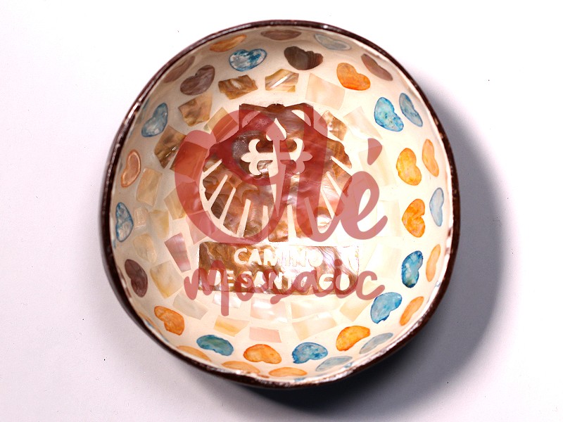 Bol de coco decorado con coloridos corazones, inspirado en el Camino de Santiago. Este atractivo bol presenta un diseño de mosaico diseño artesanal, pintado a mano, en tonos azules, naranjas y naturales, con un motivo central de la concha del peregrino y la inscripción « CAMINO DE SANTIAGO ». Su elegante forma ovalada y su acabado en tonos suaves lo convierten en una pieza única, ideal para decoración o uso diario, evocando la tradición y el simbolismo de esta famosa ruta.