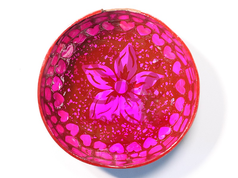 Bol de coco fucsia decorado con una flor vibrante en el centro. Este atractivo cuenco, hecho de coco, presenta un diseño llamativo con tonos fucsia y detalles en forma de corazones alrededor del borde. La técnica de diseño artesanal, pintado a mano, asegura la singularidad de cada pieza, convirtiéndolo en un hermoso accesorio decorativo. Ideal para añadir un toque alegre y colorido a cualquier hogar.