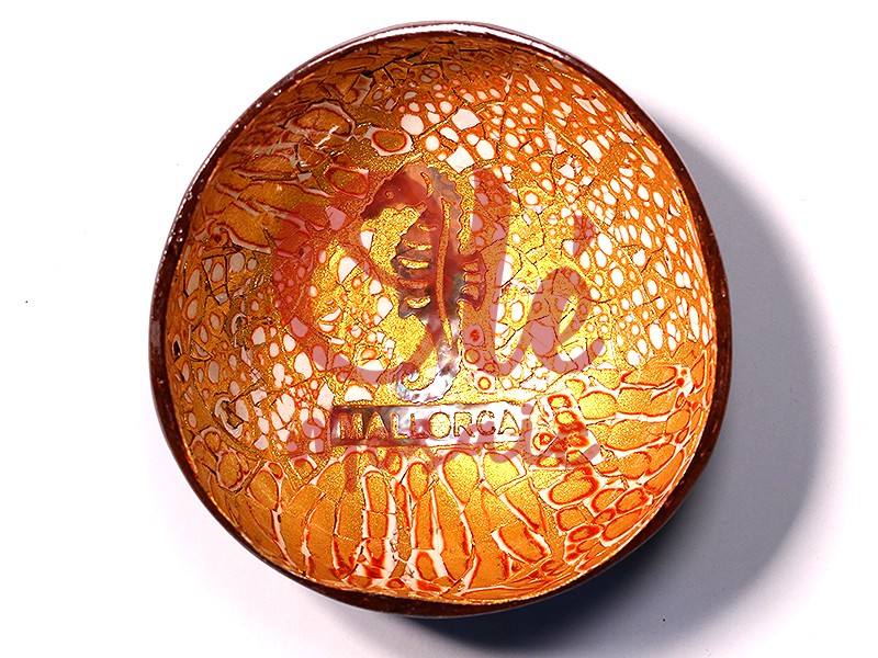 Bol de coco naranja, en Mallorca y decorado con un delicado caballito de mar. Su superficie luce intrincados patrones dorados y anaranjados entrelazados, creando una estética luminosa y acogedora. Este atractivo recuerdo evoca la esencia del Mediterráneo, con la inscripción « MALLORCA » grabada en el centro, lo que lo convierte en un souvenir perfecto de las tradiciones isleñas. Ideal como elemento decorativo o como pieza funcional en cualquier hogar.