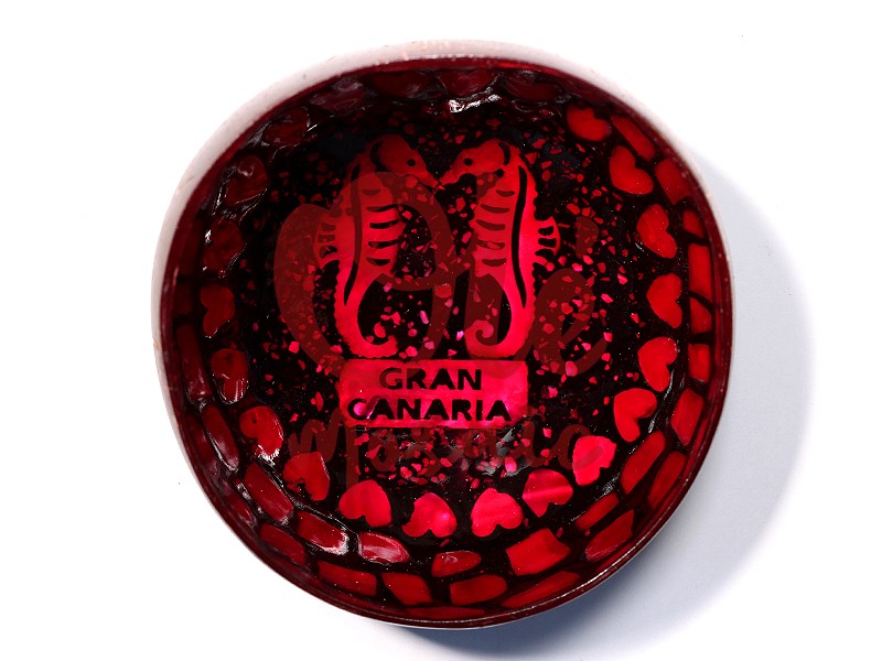 Bol de coco rojo, decorado con caballitos de mar y un diseño vibrante inspirado en Gran Canaria. Este colorido bol, hecho de coco, presenta un acabado brillante que resalta los detalles de los caballitos de mar en tonos rojos sobre un fondo negro, junto con la inscripción « Gran Canaria ». Su atractivo borde adornado con pequeños corazones le añade un toque único, convirtiéndolo en un souvenir perfecto y funcional de la belleza del archipiélago canario.