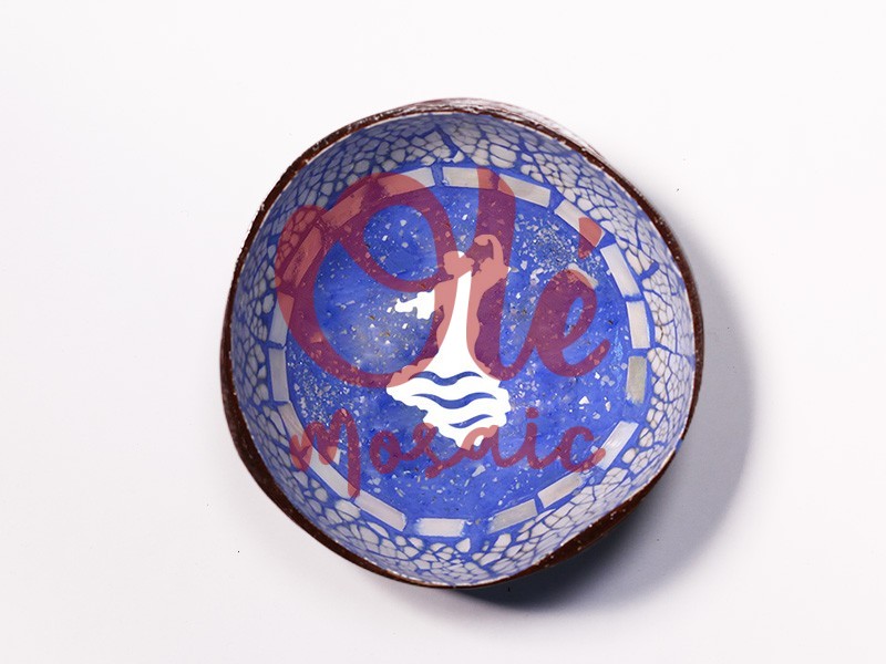 Bol de coco azul, decorado con la imagen de una bailaora flamenca. Este original bol, elaborado a partir de una cáscara de coco, presenta un fondo azul vibrante que realza la silueta blanca de una bailaora en movimiento, rodeada de un diseño en mosaico. La técnica de diseño artesanal, pintado a mano, y los delicados detalles hacen de este bol un recuerdo único y representativo del rico folclore español. Ideal para decoración o como atractivo objeto de colección.