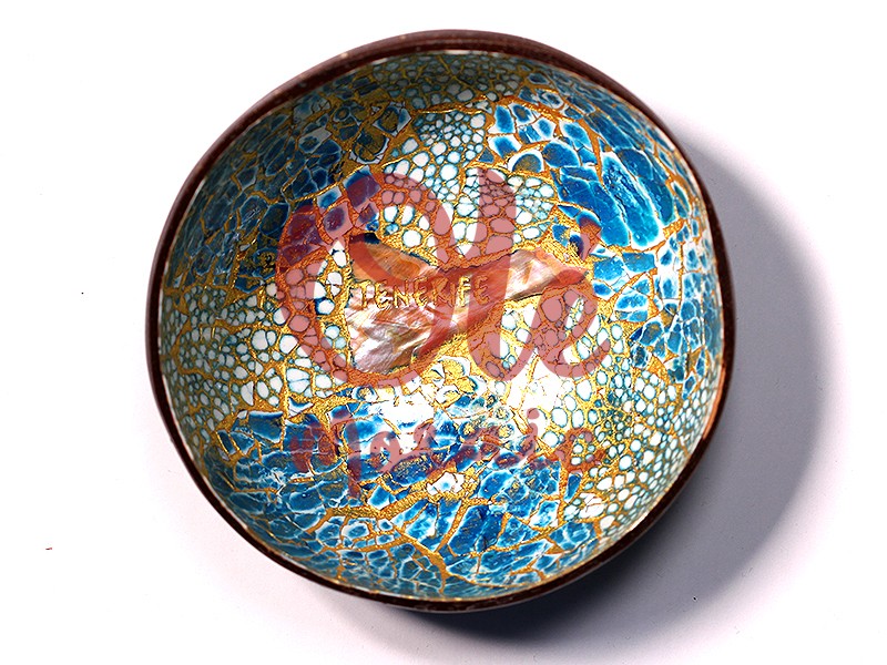 Bol de coco azul, inspirado en la belleza de Tenerife. Este elegante bol está elaborado en coco y decorado con un vibrante diseño en tonos azules y dorados, que evocan el mar y el cielo de la isla. En el centro, un toque distintivo con la inscripción « Tenerife » destaca en madreperla. La técnica artesanal utilizada realza las texturas marinas y la riqueza cromática, convirtiéndolo en una pieza decorativa y funcional ideal para cualquier hogar.