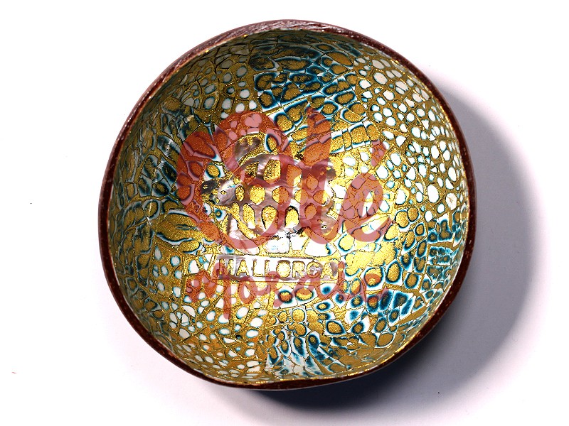 Bol de coco azul decorado con un elegante diseño de tortuga, símbolo de la fauna marina de Mallorca. Este original artículo está fabricado a partir de una cáscara de coco, diseño artesanal, pintado a mano, con tonos azules y dorados que recrean un fondo vibrante y atractivo. En el centro del bol, destaca la imagen de la tortuga, acompañada del texto « MALLORCA », encapsulando la esencia de la isla en un objeto decorativo único. Ideal como centro de mesa o pieza ornamental.