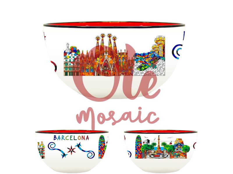 Bol de cerámica de 11 cm con una panorámica de Barcelona en colores vibrantes. Este bol presenta una cuidada ilustración de la Sagrada Familia y el famoso mosaico del Park Güell, destacando la rica arquitectura modernista de la ciudad. El interior rojo realza el diseño exterior, que incluye elementos icónicos como la Torre Glòries y motivos florales, todo diseño artesanal, pintado a mano, con gran detalle, lo que lo convierte en una pieza única y decorativa ideal para cualquier hogar.