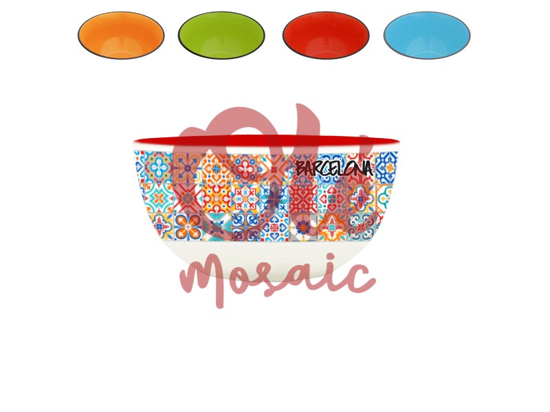 Bol de cerámica de 9 cm, decorado con vibrantes mosaicos que capturan la esencia de Barcelona. Este cautivador bol exhibe una variedad de patrones coloridos en tonos azules, naranjas y rojos, que evocan el famoso trencadís de Gaudí. Con el interior blanco y el borde rojo, es un artículo funcional y decorativo, ideal para realzar cualquier mesa o como un original recuerdo. Destaca el nombre « Barcelona », añadiendo un toque distintivo a este diseño artesanal.