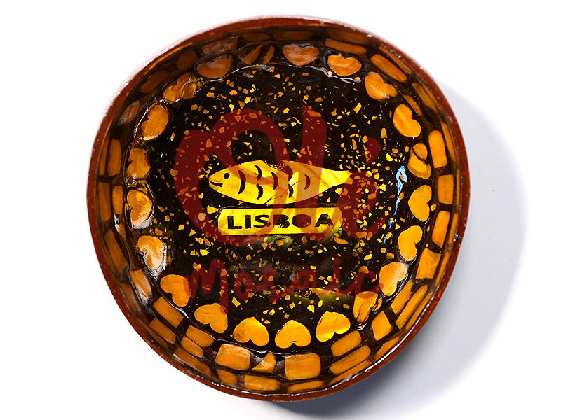 Ce bol en noix de coco jaune est un authentique souvenir qui capture l’essence de Lisbonne, célébrant la riche culture gastronomique de la ville. Son design vibrant et attrayant se distingue par sa finition brillante qui met en valeur la couleur jaune prédominante, apportant une touche joyeuse et lumineuse. Entouré d’un bord décoré de délicats cœurs dans les tons marron et jaune, le bol présente une figure de sardine au centre, emblématique de la tradition culinaire lisboète, accompagnée du mot « LISBOA ». Cette représentation est non seulement visuellement attrayante, mais elle évoque également la popularité de la sardine dans la gastronomie locale, notamment lors des fêtes comme celles de Santo Antonio.