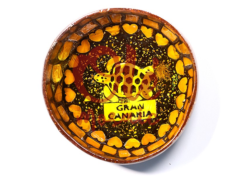Bol de coco de color amarillo, decorado con una simpática tortuga que representa la belleza natural de Gran Canaria. Este bol único, hecho de coco, presenta un diseño artesanal, pintado a mano, con detalles dorados, subtítulos y corazones que enmarcan la escena. Ideal para servir aperitivos o como pieza decorativa, evoca la esencia del encanto canario, convirtiendo este bol en un auténtico souvenir de la región.