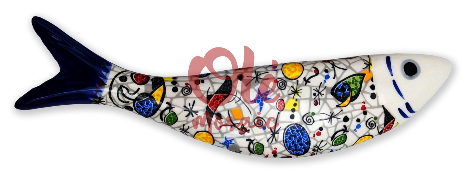 Pendentif en céramique en forme de sardine, qui représente le symbolisme traditionnel du poisson à Lisbonne. Ce charmant objet décoratif est de conception artisanale, peint à la main, et présente une variété colorée de motifs abstraits dans des tons bleus, rouges, jaunes et verts sur un fond blanc. La céramique de haute qualité et le design vibrant font de ce pendentif une pièce idéale pour ajouter une touche de culture portugaise à tout espace.