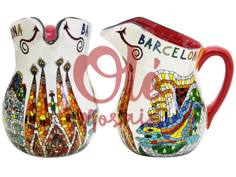 Jarra de cerámica con una vibrante panorámica de Barcelona. Esta pieza destaca por su diseño en tonos beige y rojo, decorada con coloridas ilustraciones de la Sagrada Familia y el famoso mosaico del Park Güell. Cada detalle está diseño artesanal, pintado a mano, lo que le da un toque artístico único. La inscripción « Barcelona » añade un encanto especial, convirtiéndola en un souvenir ideal que refleja la riqueza cultural y arquitectónica de la ciudad. Perfecta para decorar o para usar.