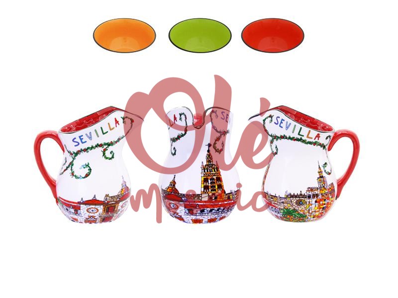 Jarra de cerámica con una atractiva panorámica de Sevilla en tonos beis. Este producto, diseño artesanal, pintado a mano, presenta elaborados diseños que representan monumentos emblemáticos de la ciudad, como la Giralda y la Plaza de España, en un estilo colorido y vibrante. Con el borde y el asa en rojo, esta jarra es tan funcional como decorativa, ideal para añadir un toque andaluz a cualquier hogar. Perfecta para exhibir o como recuerdo.