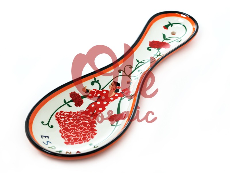 Louche en céramique décorée de l’image d’une danseuse de flamenco, qui évoque l’essence de l’Espagne. Cet ustensile attrayant, dans des tons beiges et avec un élégant bord noir, présente un design artisanal, peint à la main, avec des motifs floraux et des détails en rouge. La danseuse, vêtue d’une robe vibrante à pois, tient un bouquet d’œillets, capturant la joie du folklore espagnol dans chaque détail. Idéale pour apporter une touche culturelle et artistique à votre cuisine.