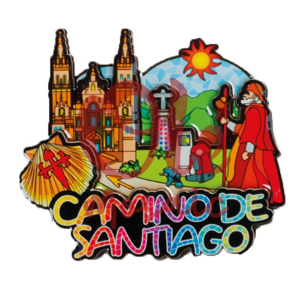 L’aimant est décoré d’un paysage de collines verdoyantes sous un soleil radieux, ajoutant une touche de couleur et de joie. Le texte « CAMINO DE SANTIAGO », présenté en lettres multicolores, met en valeur l’énergie et la diversité des expériences offertes par ce parcours riche en histoire. Ce souvenir n’embellit pas seulement n’importe quel coin de la maison, mais agit aussi comme un rappel constant de l’une des routes les plus emblématiques d’Espagne.