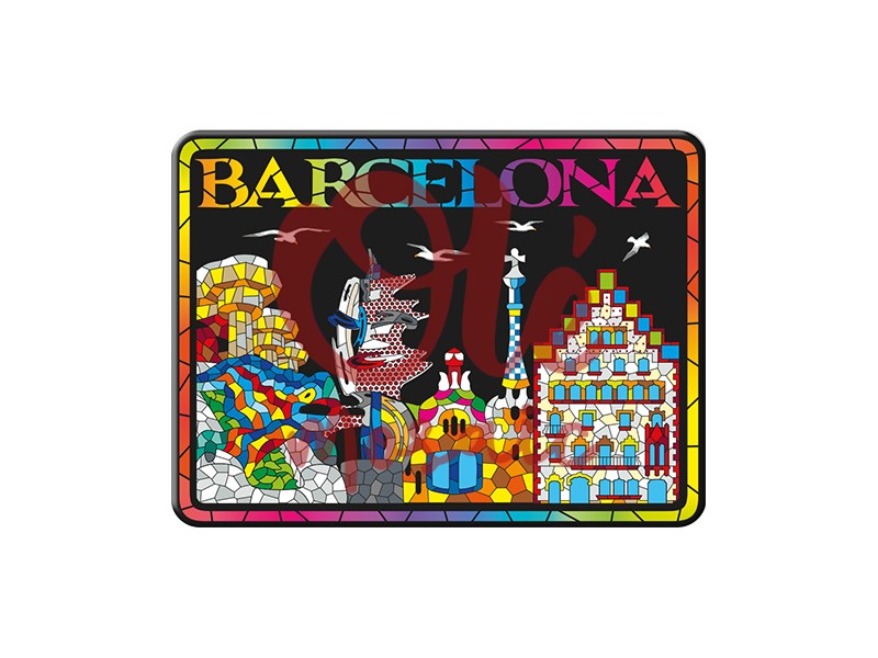 Aimant métallique avec une vibrante vue panoramique de Barcelone, qui met en valeur ses monuments emblématiques dans un design coloré de style mosaïque. Mesurant 8 cm, il présente une représentation artistique du célèbre dragon du Parc Güell, de la Casa Batlló et de la Sagrada Familia, le tout sur un fond noir qui fait ressortir les couleurs intenses. Ce souvenir est idéal pour se souvenir de la beauté architecturale de la capitale catalane et décorer toute surface métallique.