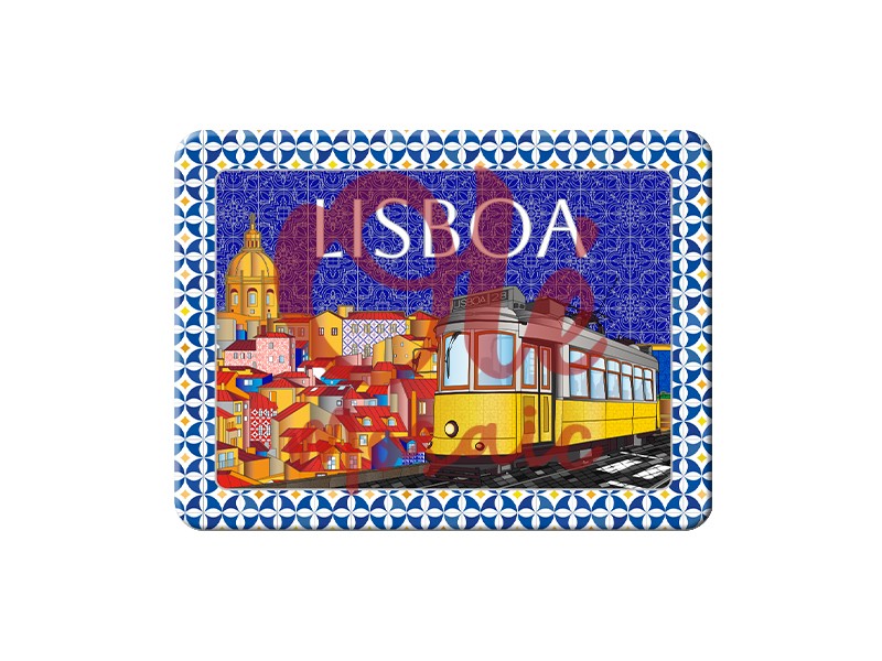 Aimant métallique avec une charmante vue panoramique de Lisbonne, de 8 cm. Cet aimant attrayant montre le célèbre tramway jaune parcourant les rues colorées de la ville, avec des maisons aux toits rouges et des détails architecturaux uniques. Son design vibrant inclut le texte « LISBOA » en lettres blanches sur un fond bleu, encadré de motifs décoratifs de carreaux traditionnels. Il est idéal pour se souvenir de votre visite dans cette magnifique ville portugaise.